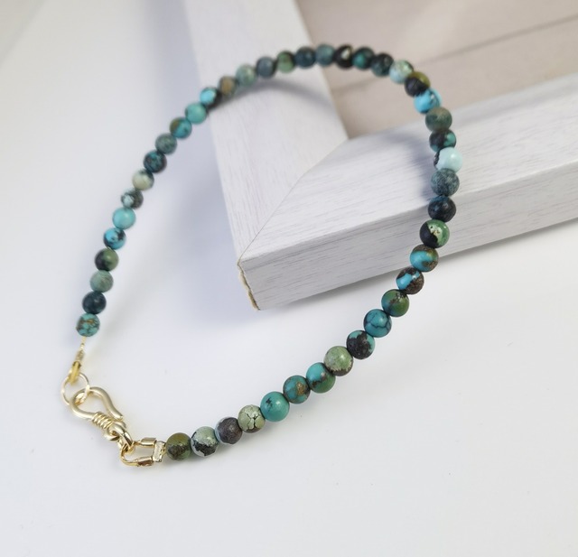 こんな方におすすめ ✅ 自然な色合いで肌なじみのいいアクセサリーを探している方 ✅ カジュアルに取り入れられるターコイズをお探しの方 ✅ 軽やかでデイリー使いしやすいジュエリーが好きな方 ナチュラルな風合い ターコイズ特有のマーブル模様が、自然な温かみを演出。 石本来の個性を活かしたデザインで、ナチュラルな雰囲気を楽しめる。 カジュアルコーデにもマッチ 軽やかで繊細なデザインだから、デイリーに使いやすい。 【使用した天然石】 ターコイズ3㎜ 内径サイズ16㎝ 手首サイズ15cm~16㎝に対応します。 内径サイズ17㎝ 手首サイズ16cm~17㎝に対応します。 金具素材: 銅 14KGP 番号 SH-CJW ●天然石の為、予めご了承くださいませ。 ・入荷時期により、色合いが若干変わる場合が御座います。 ・内包物、クラック、表面のカケなどある場合がございます。天然の風合いとしてご理解下さいませ。 ※画像について モニターの環境によって若干色合いなどが変わることがございますので、ご了承下さいませ。 できる限り実際の商品の色合いに近づけておりますので、ご安心下さい。