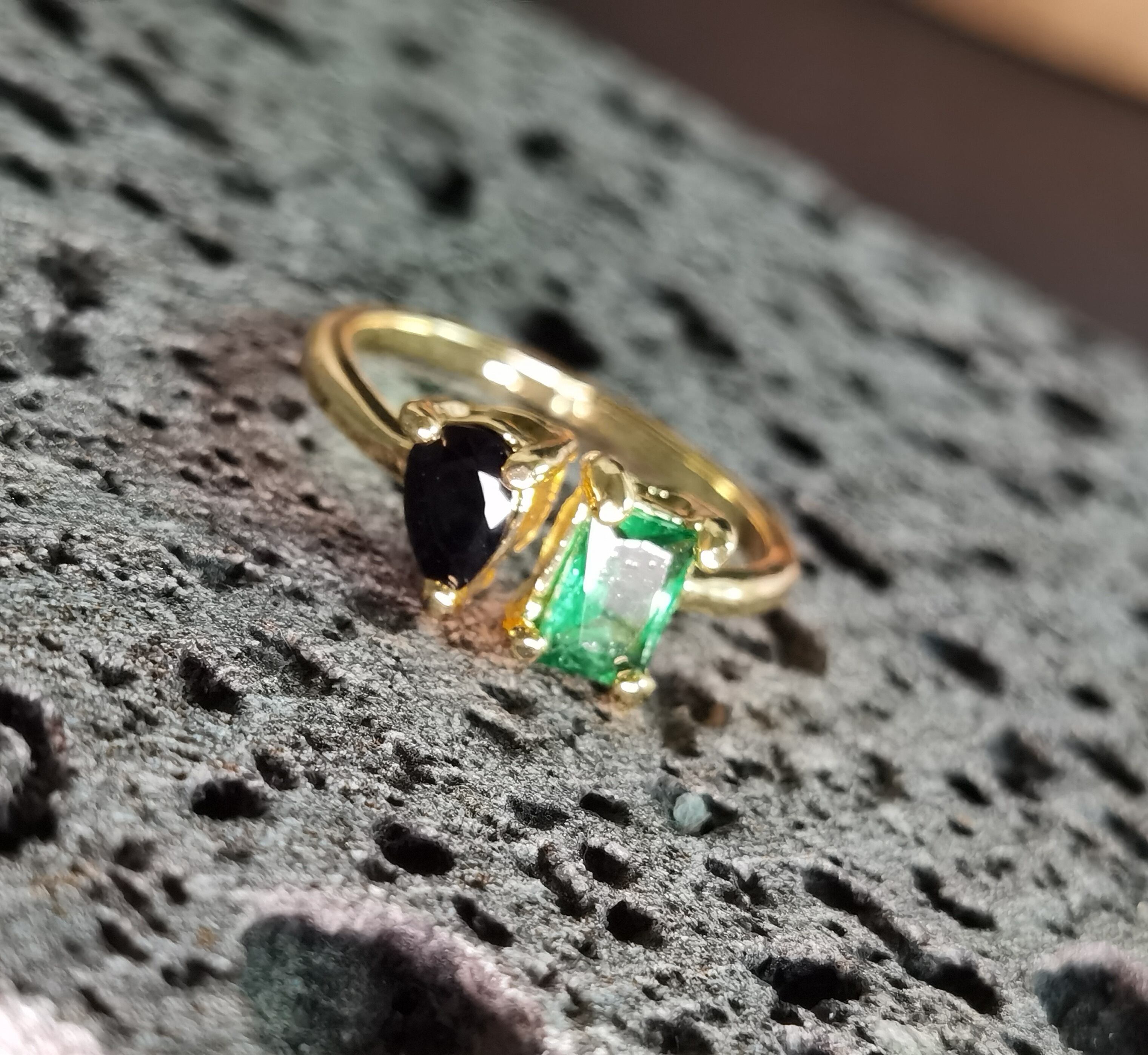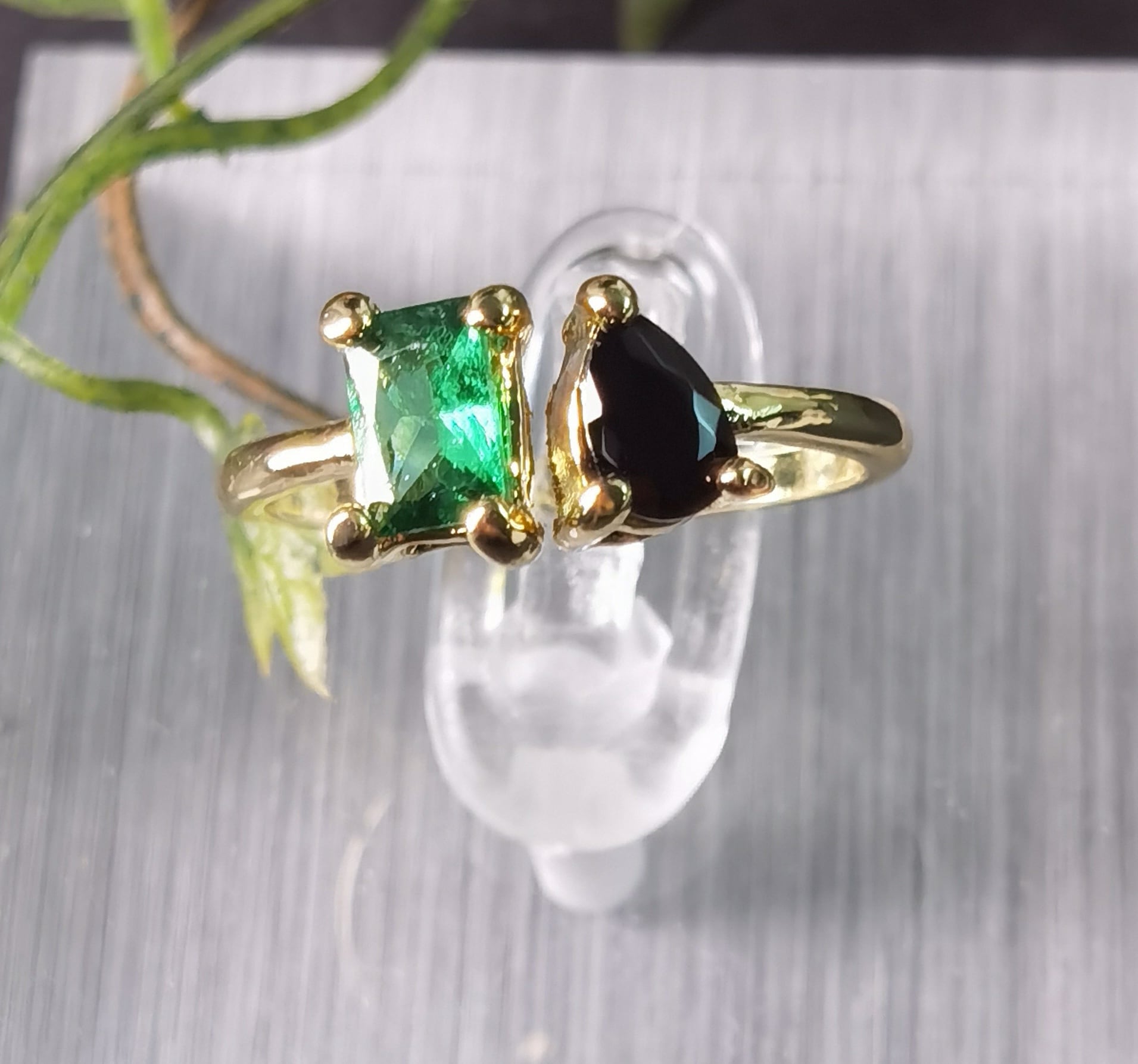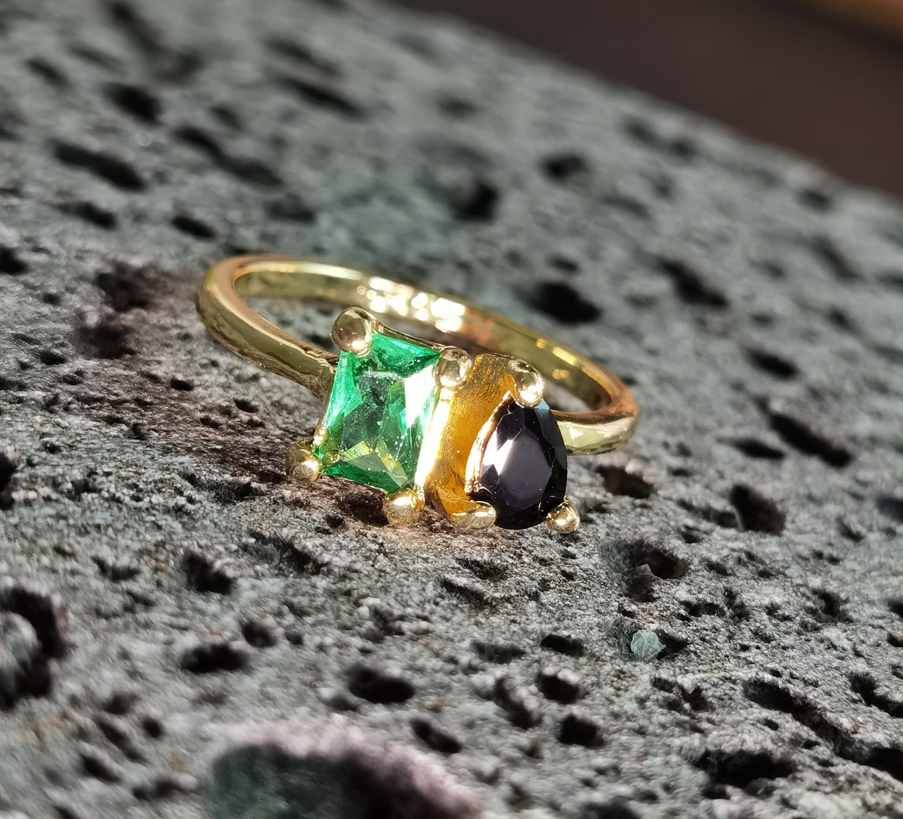 ☆2つの誕生石を組み合わせたジルコニアリングです。緑のエメラルドカットのジルコニアと、深いスピネルのティアドロップ型の石が対照的な美しさを演出しています。ゴールドの繊細なリングフレームは、宝石の輝きを一層引き立て、高級感を漂わせます。