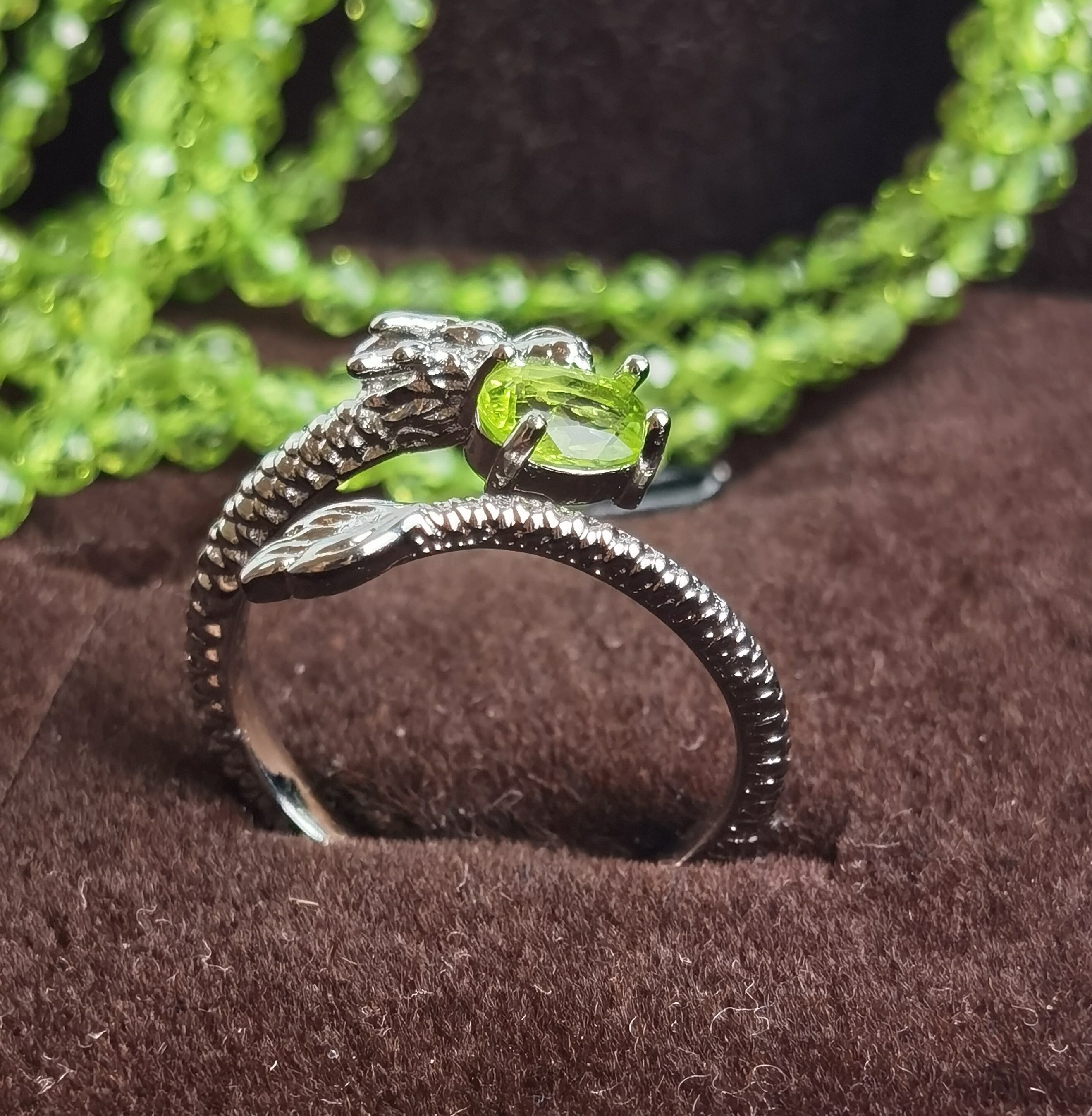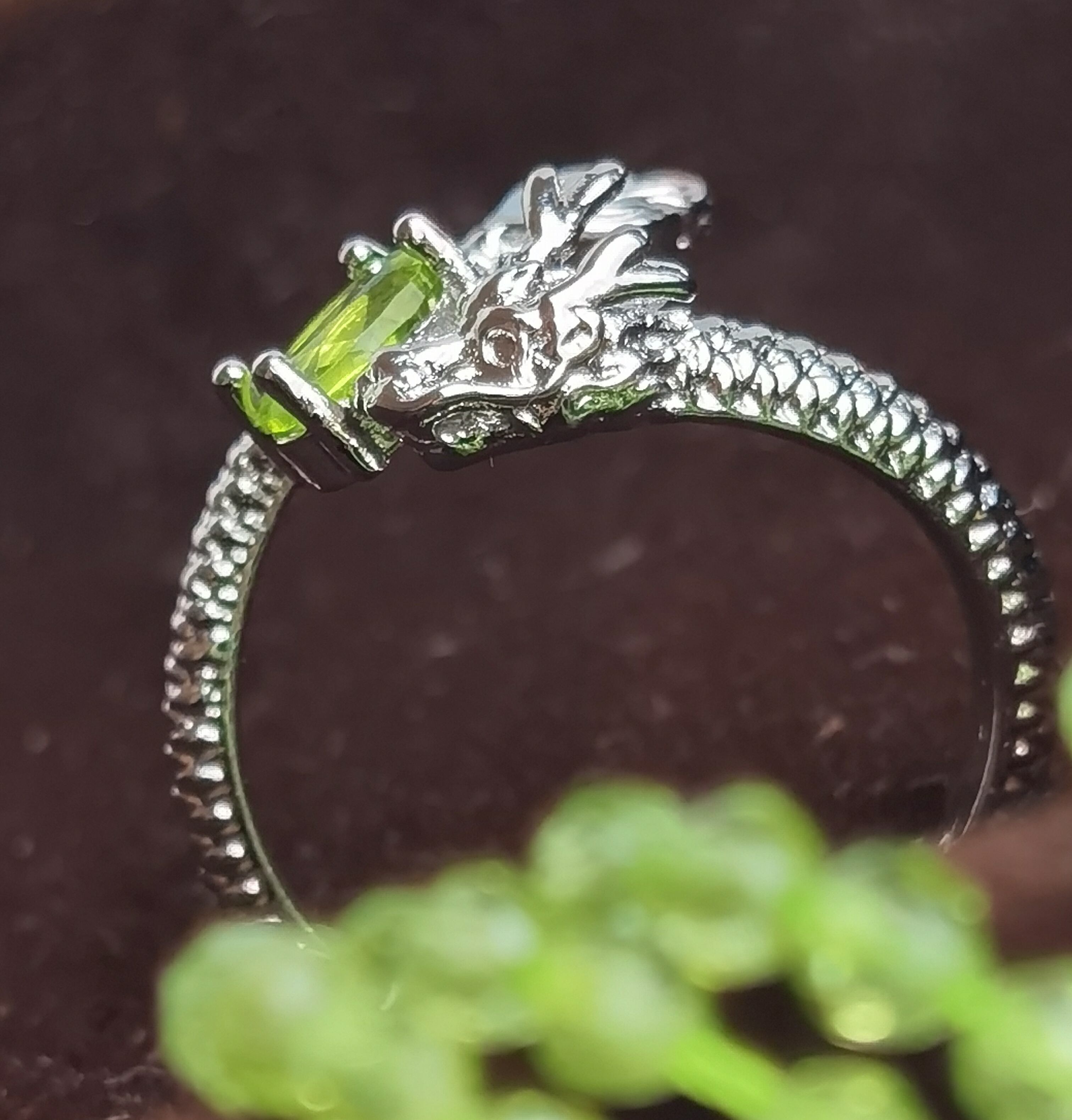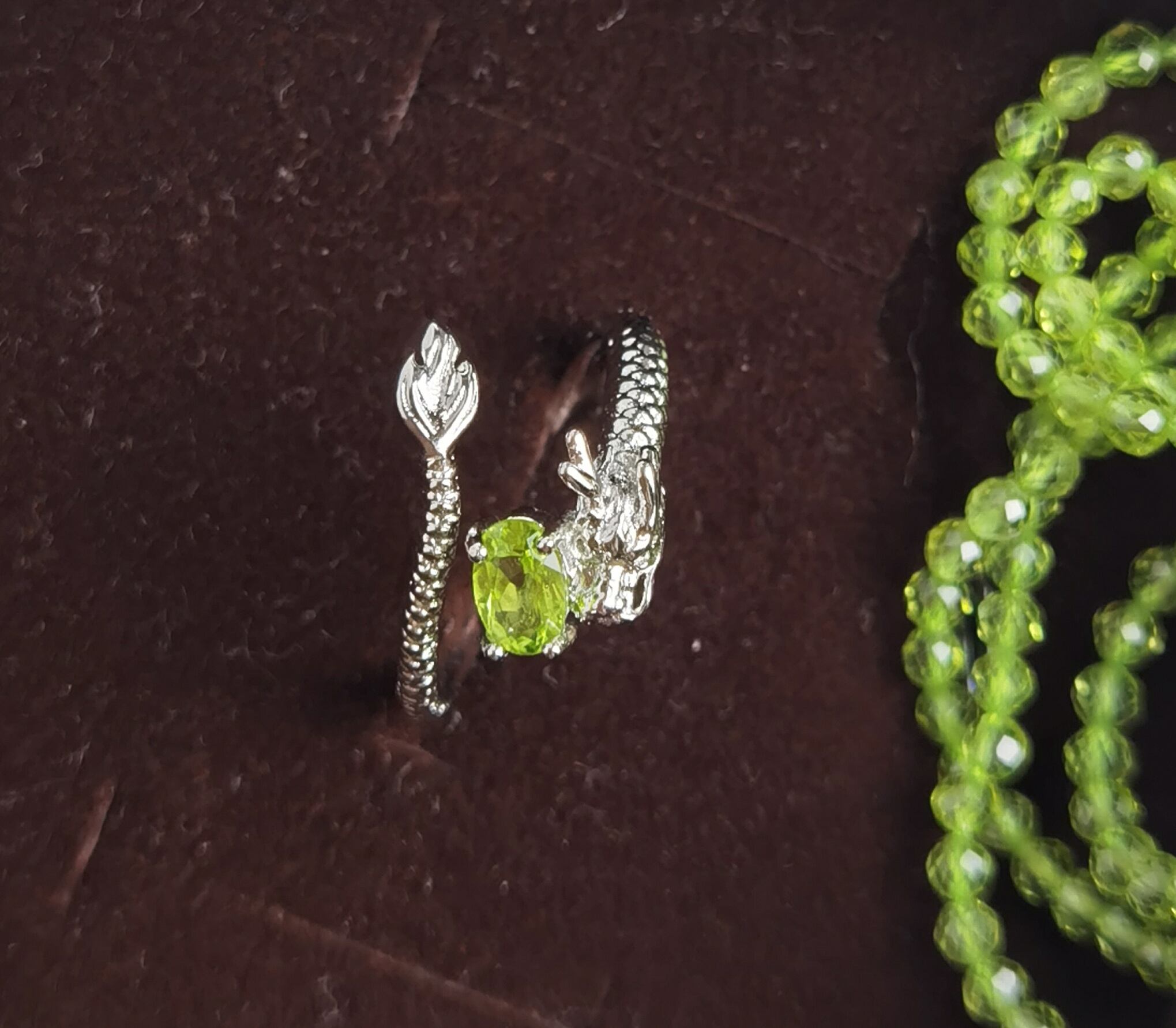 --☆洗練されたデザインで「龍」という干支を象徴しています。中央にセットされたペリドットは、鮮やかな緑色が特徴で、生命力と繁栄の象徴です。リングの龍は細かいスケールのディテールが施され、ダイナミックでありながら優美な印象を与えます。龍は力強さや幸運を呼ぶとされており、ペリドットのクリアな緑は持ち主に平和と富をもたらすとも言われています。この組み合わせは、見る人の目を引き、身につける人に自信と魅力を与えるでしょう。