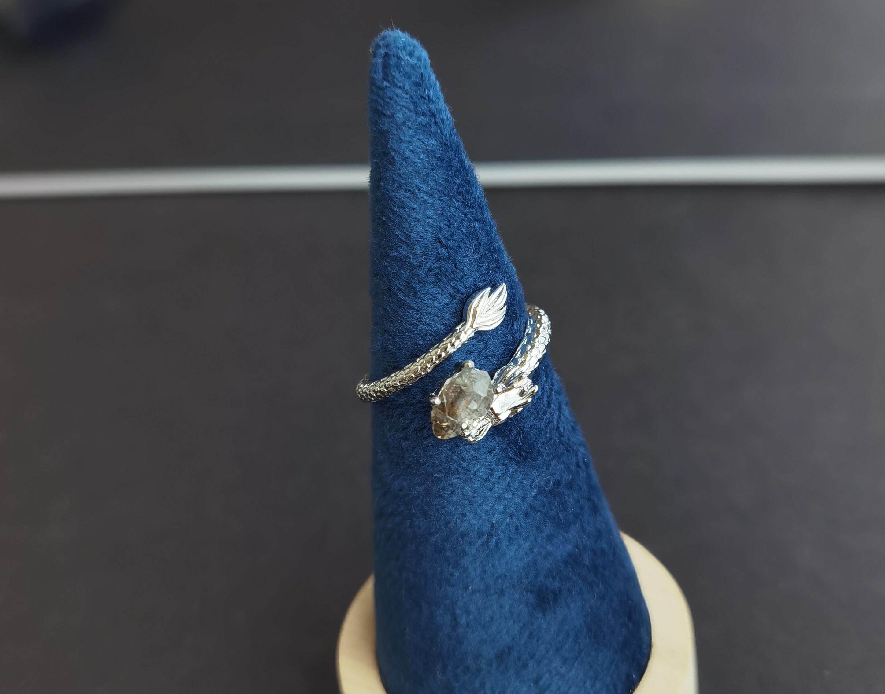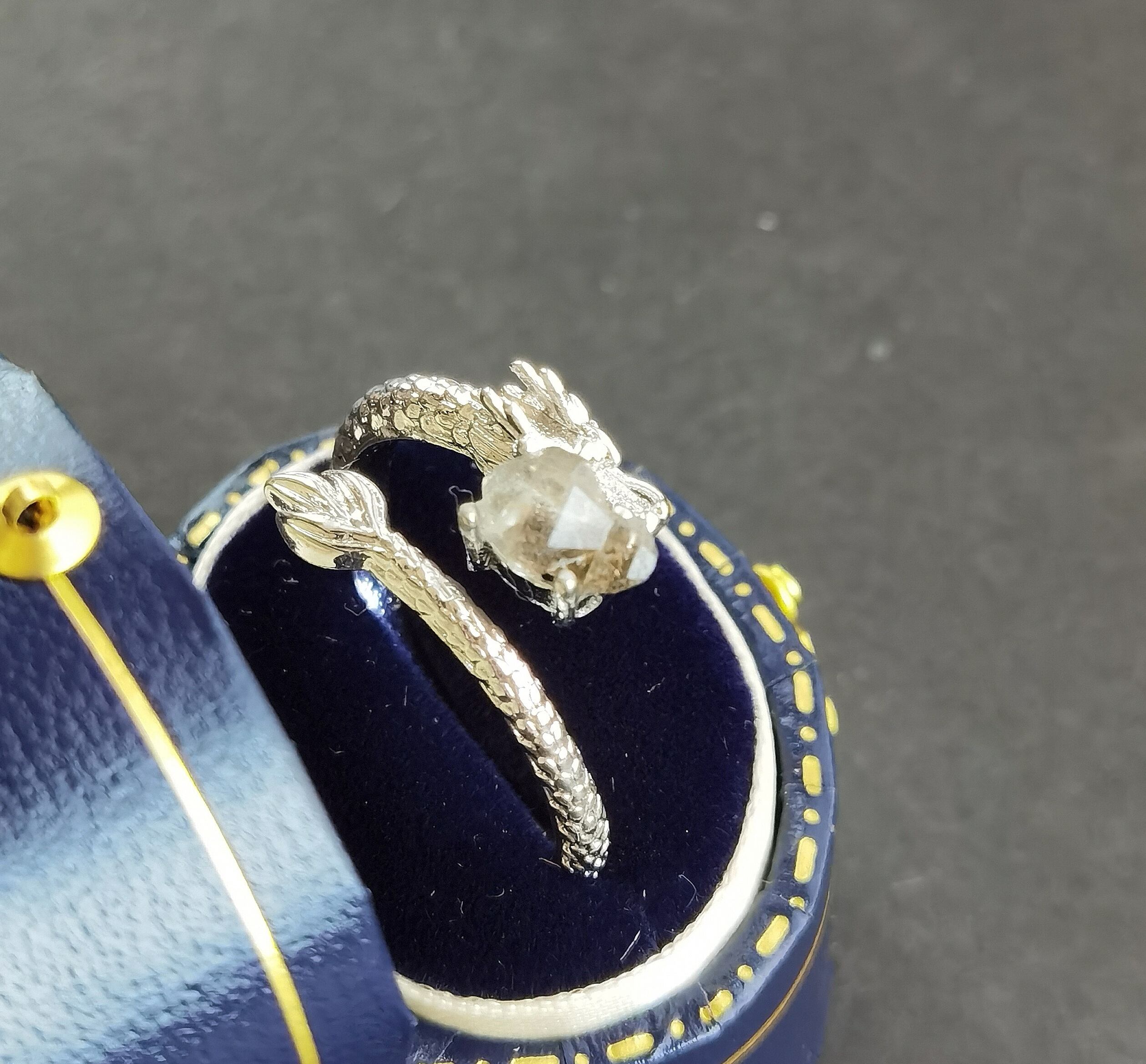 -☆洗練されたデザインで「龍」という干支を象徴しています。ハーキマーダイヤモンド原石が中心に据えられ、その透明感と独特の輝きが目を引きます。リングの龍は細かいスケールのディテールが施され、ダイナミックでありながら優美な印象を与えます。龍は力強さや幸運を呼ぶとされており、