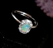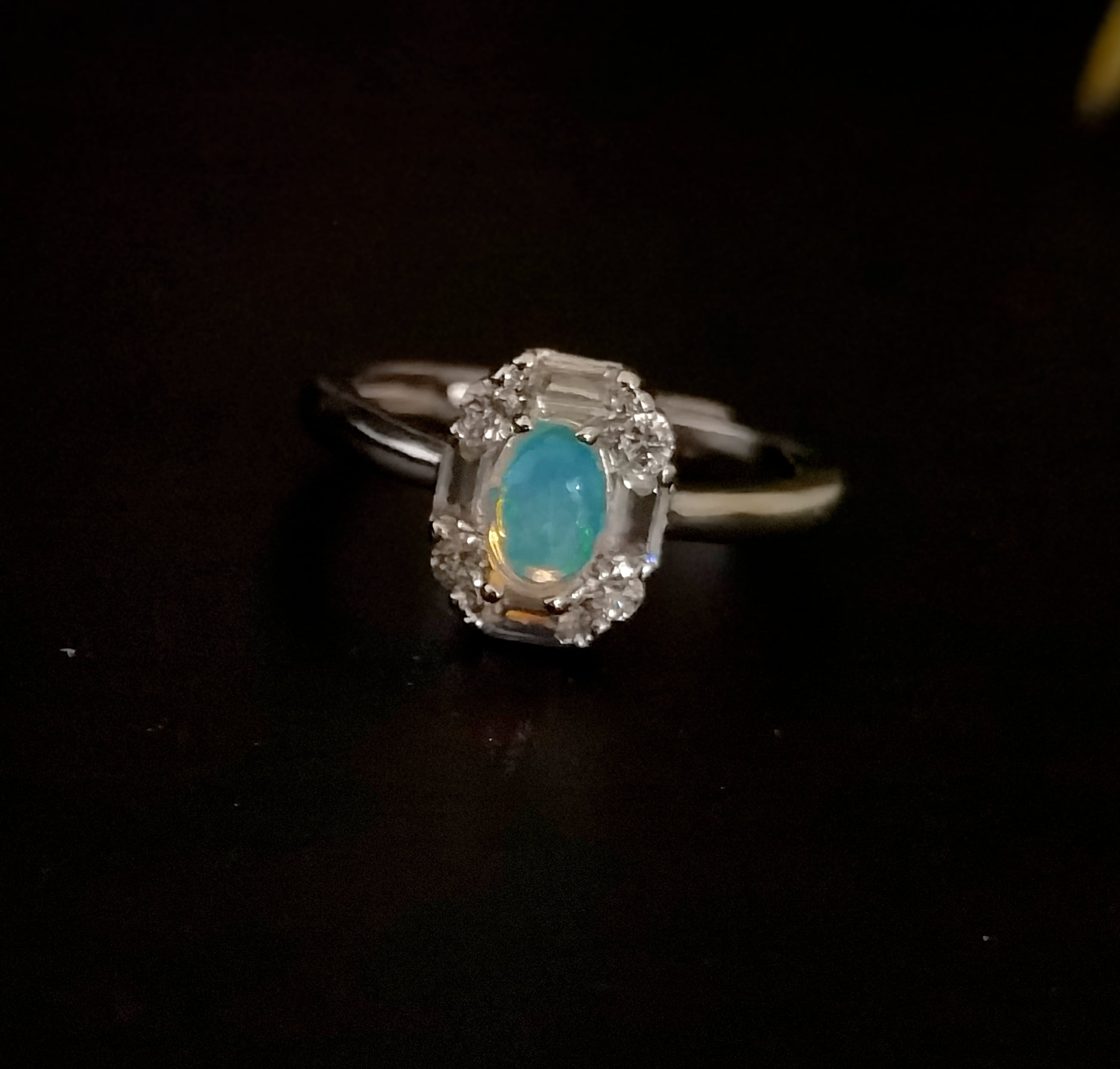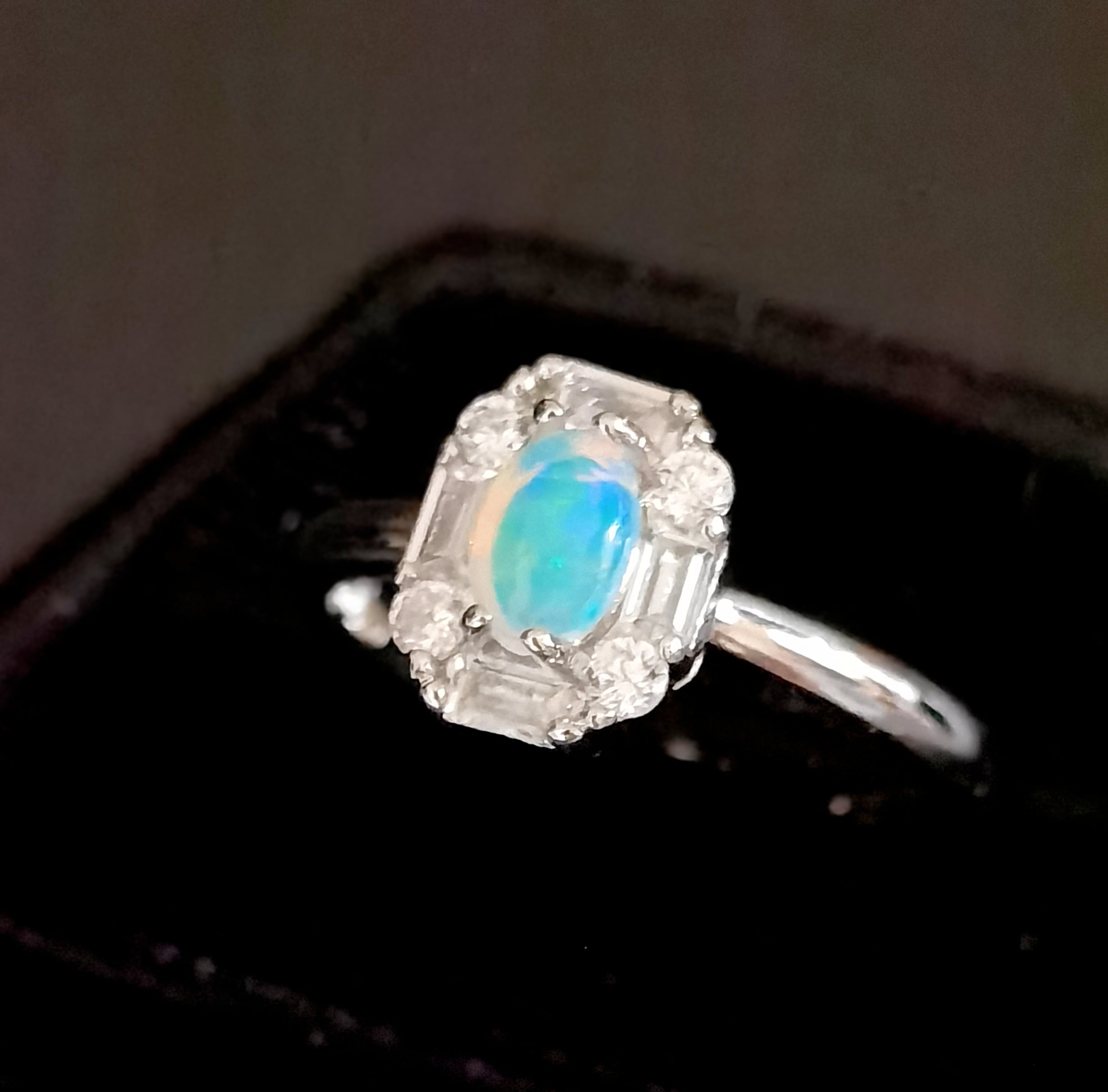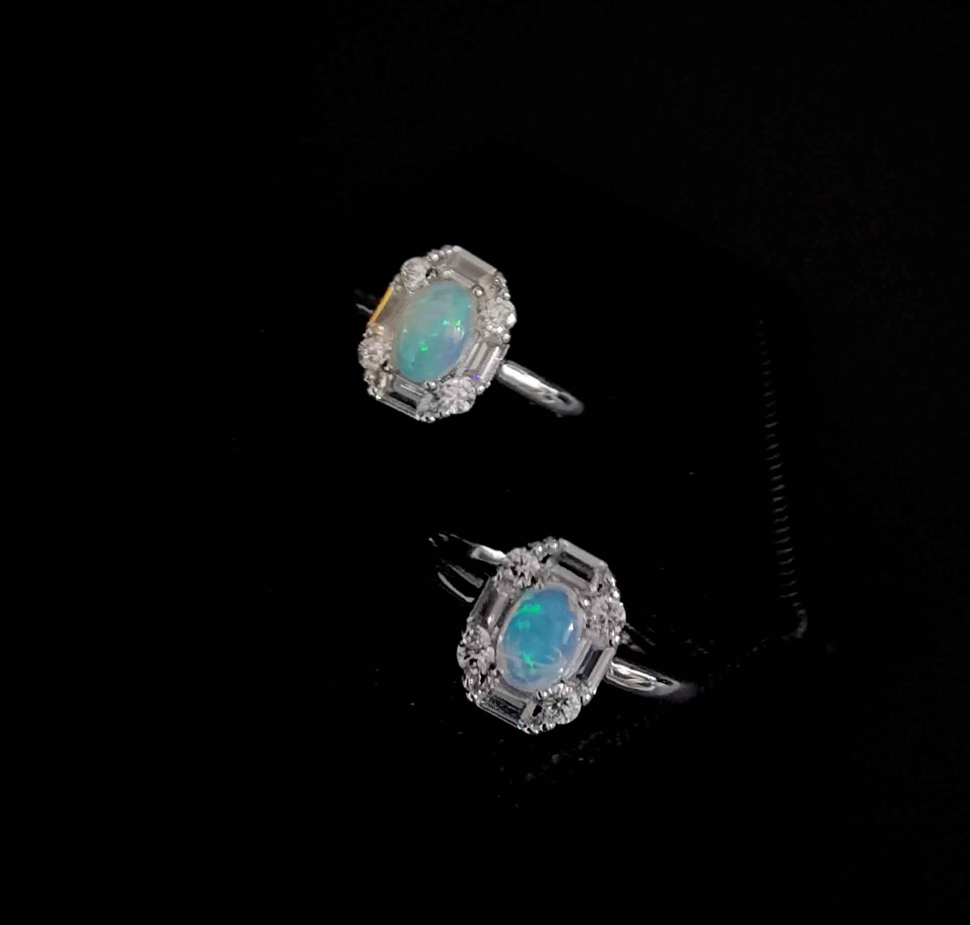 CZダイヤは、✨星ような輝きを持ちながらも手頃な価格が魅力。これがファイヤーオパールを繊細に囲んでおり、リング全体の華やかさを一層引き立てています。