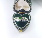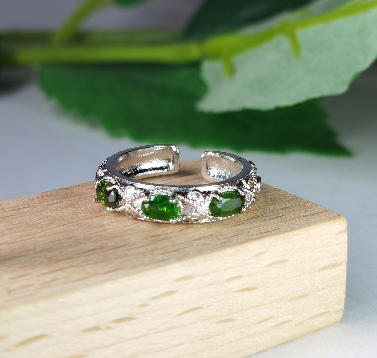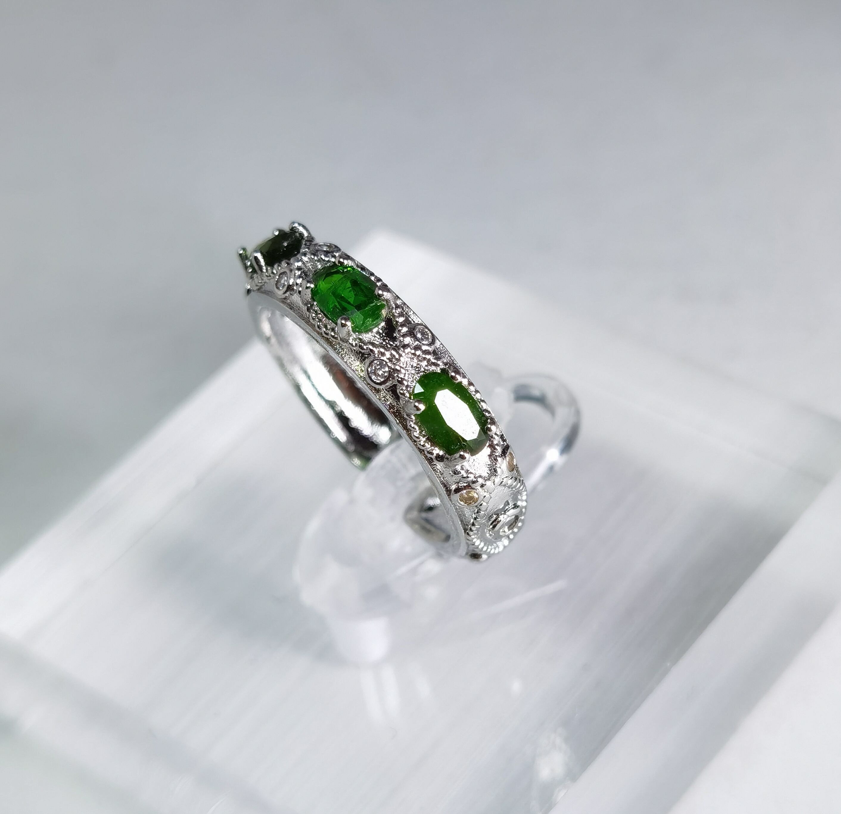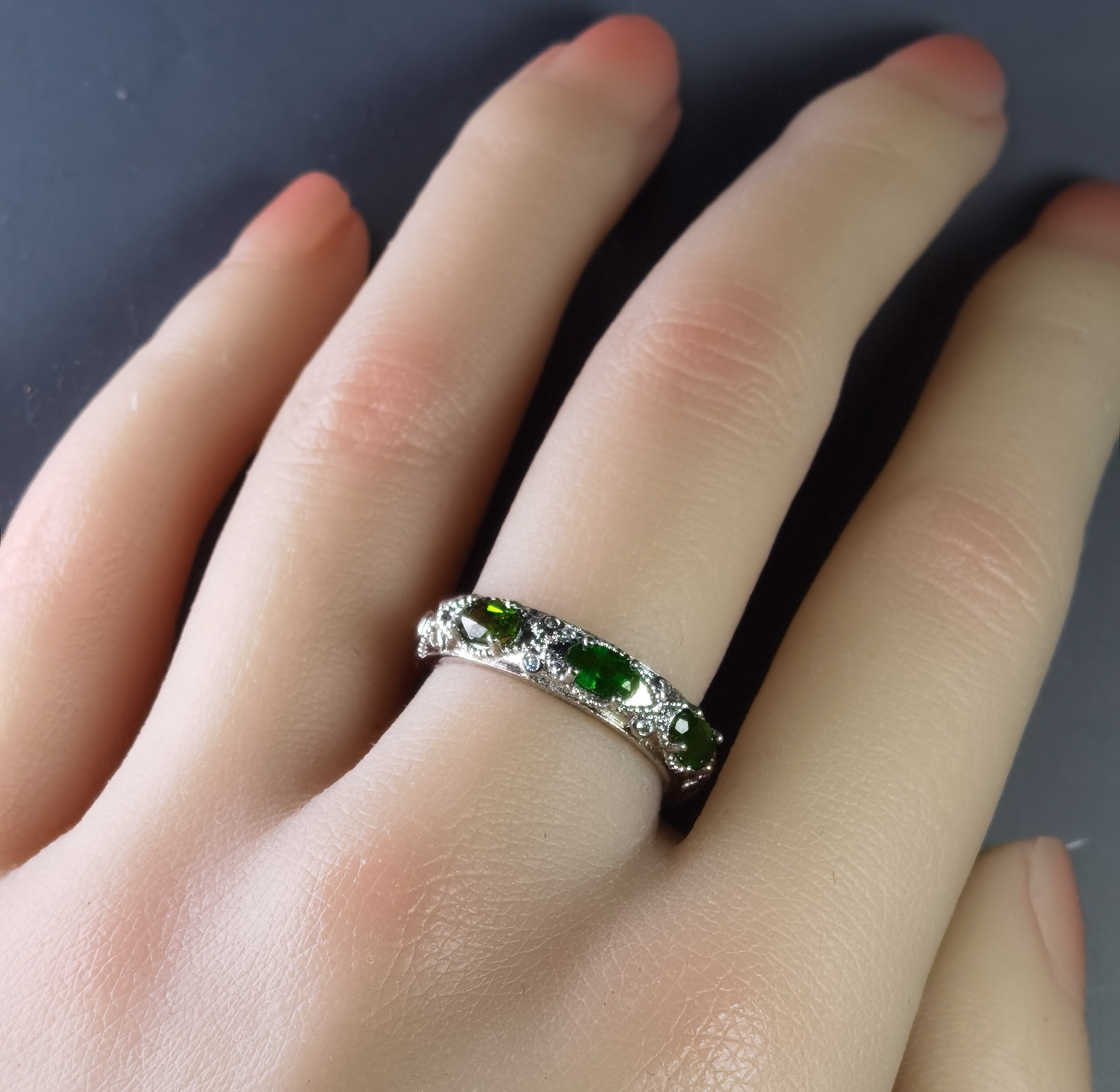 ◎深みのあるグリーンアパタイトが3石並び、アンティーク風の透かし装飾と共に輝きます。