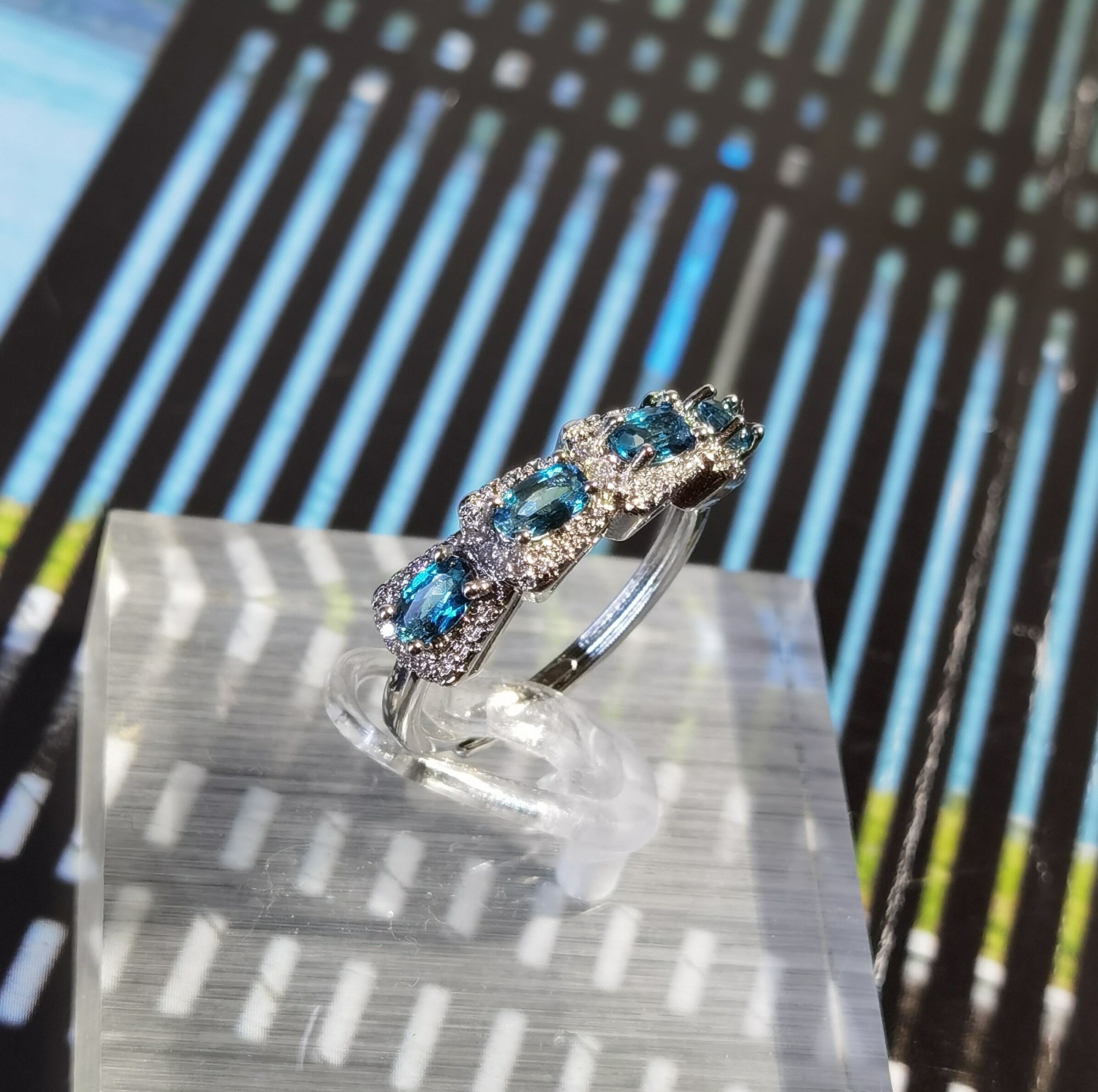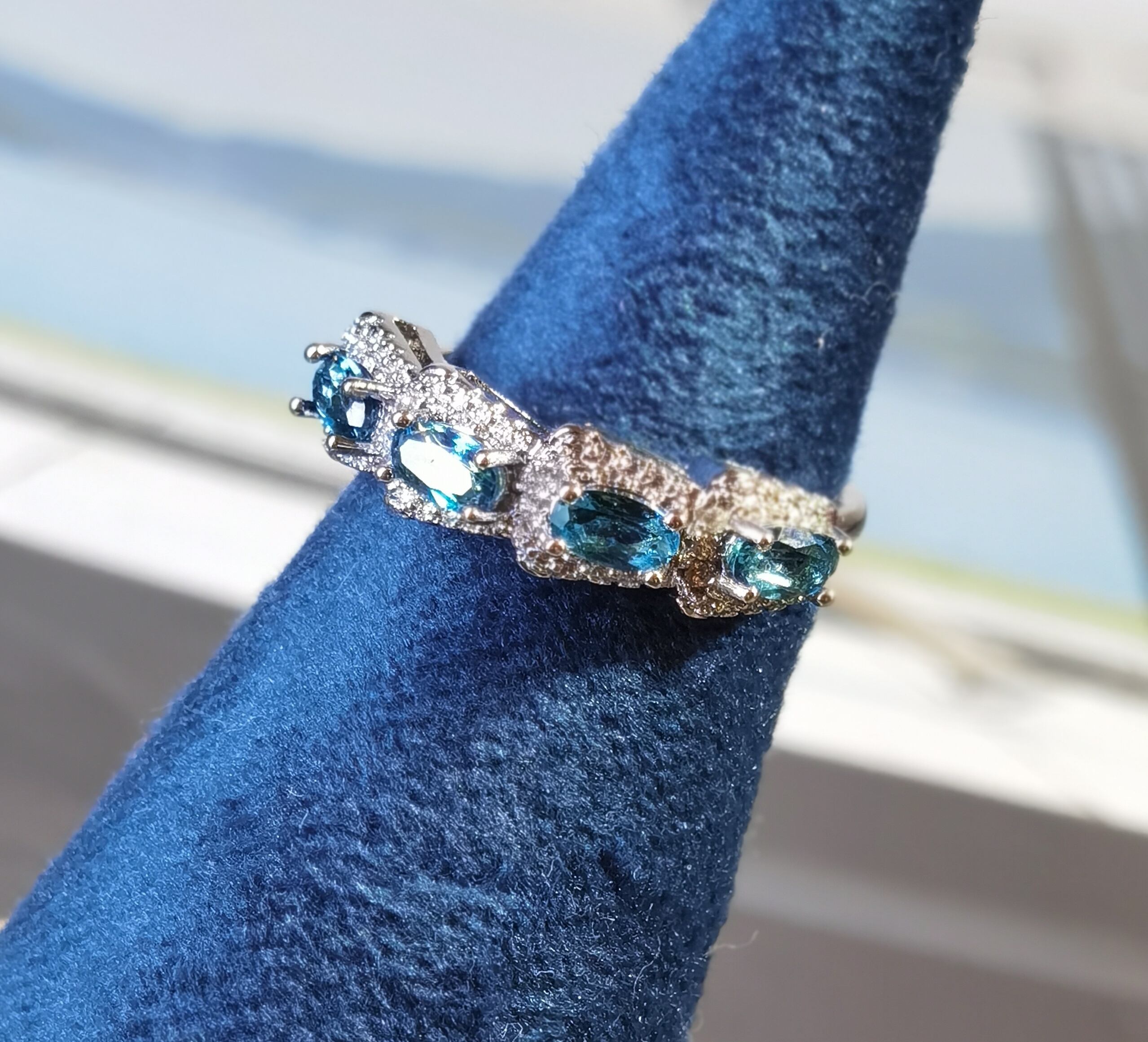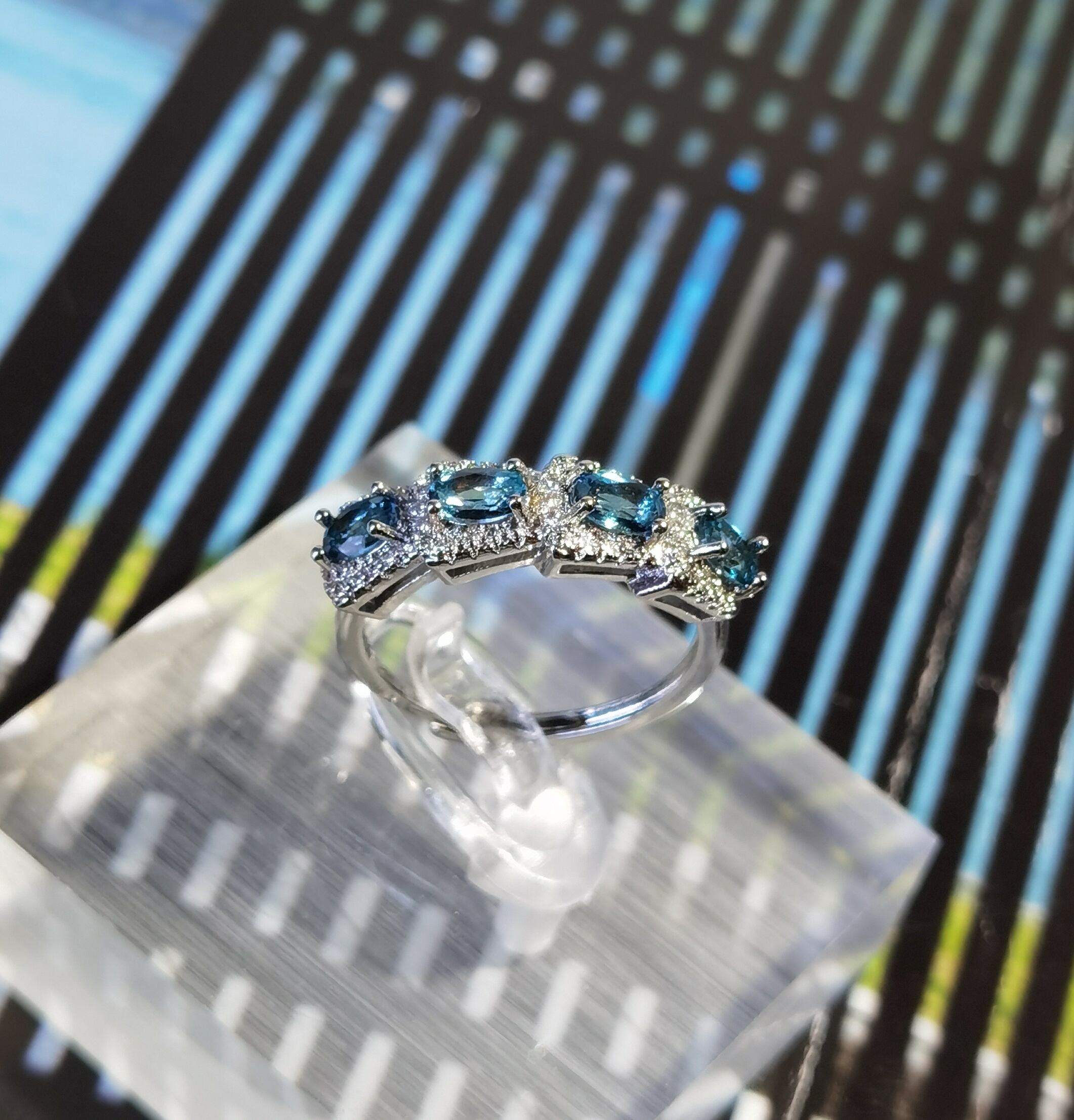 ~濃く鮮やかなブルートパーズを連ねた贅沢なデザイン。楕円カットのトパーズを蛇の鱗のように並べ、その周囲をメレストーンで囲むことで、煌めきが連続して流れるような印象を生み出しています。蛇は古来より「再生」「守護」「富」を象徴するモチーフであり、リング全体に神秘的で力強いエネルギーを宿しています。