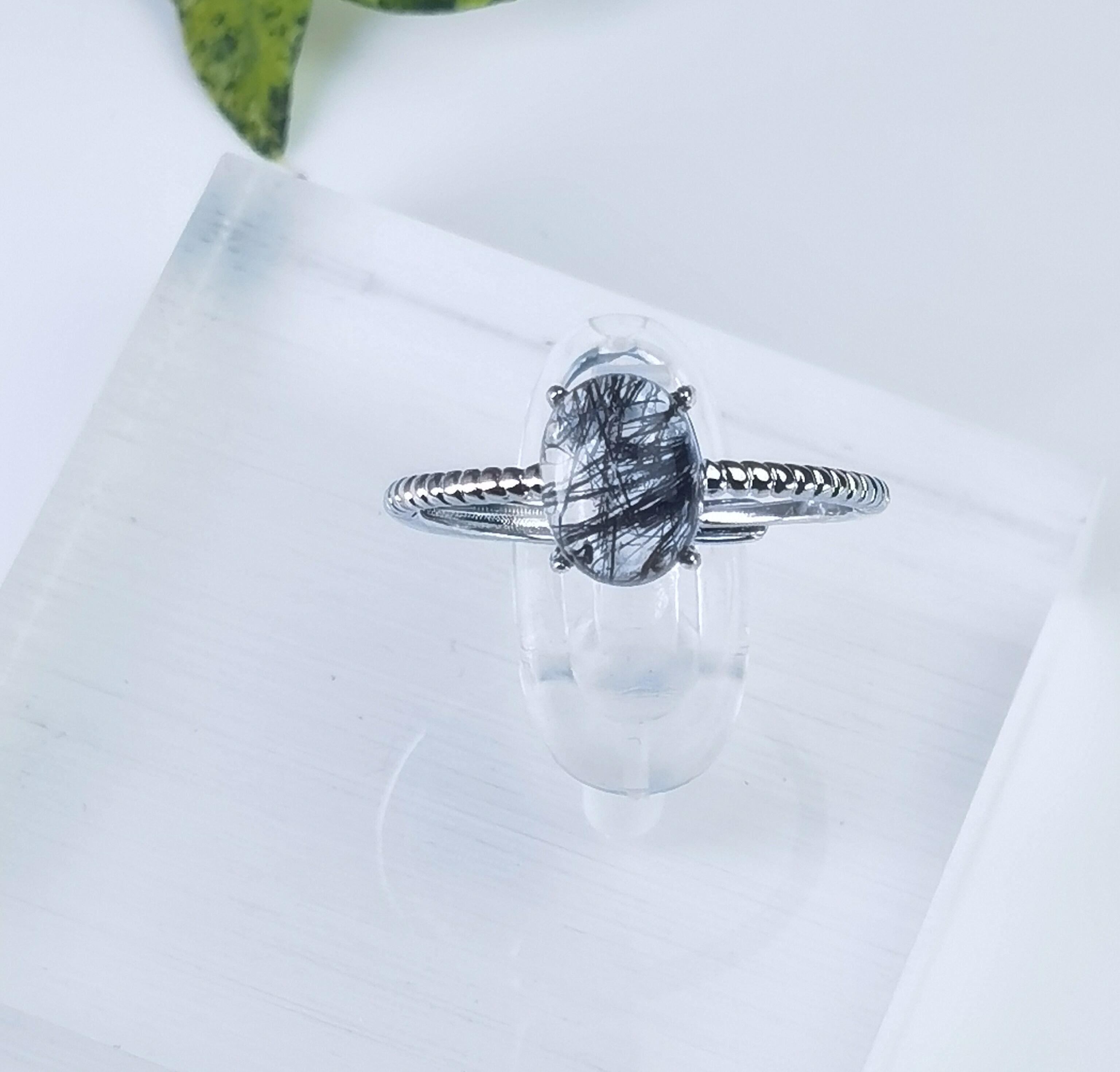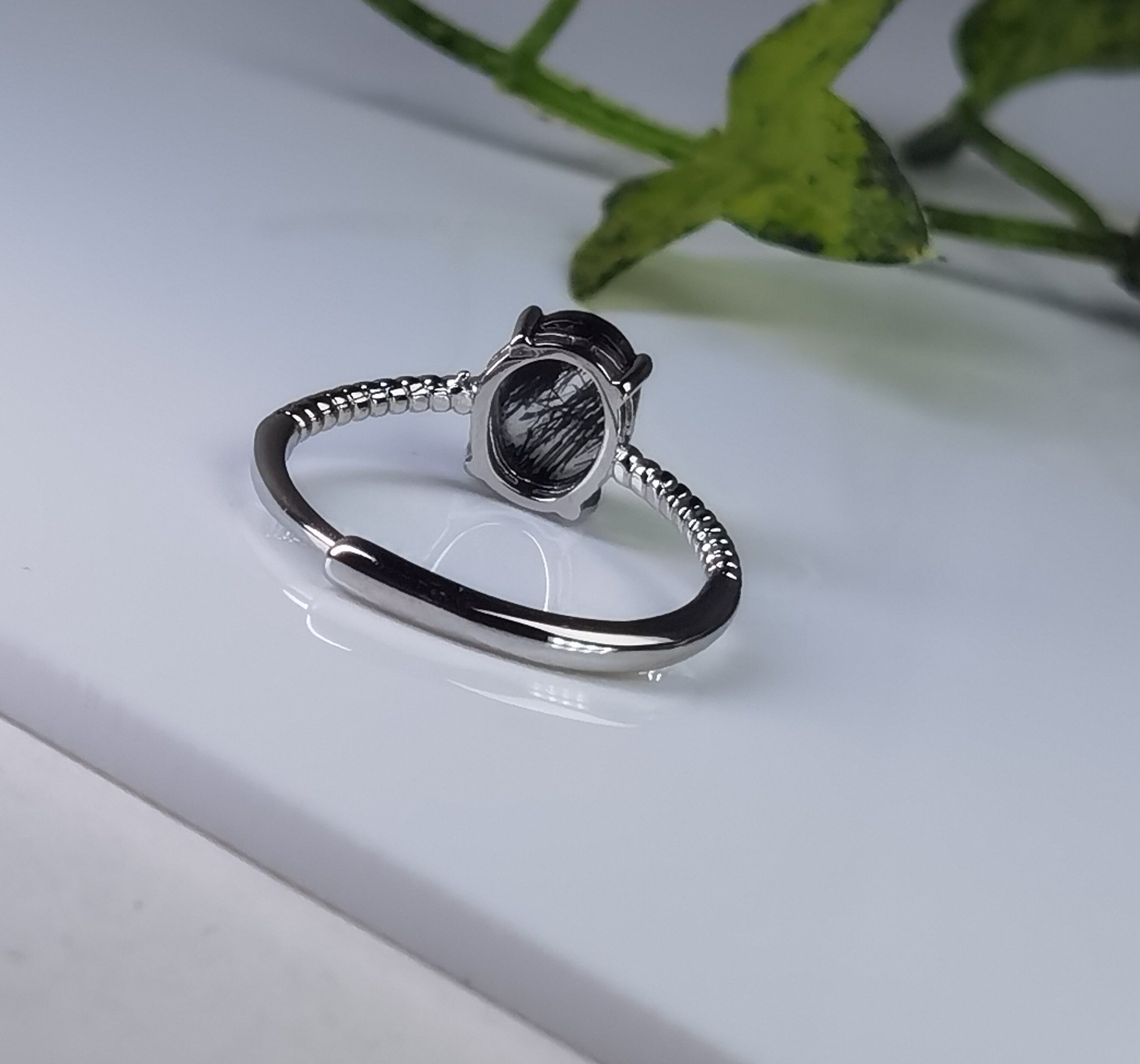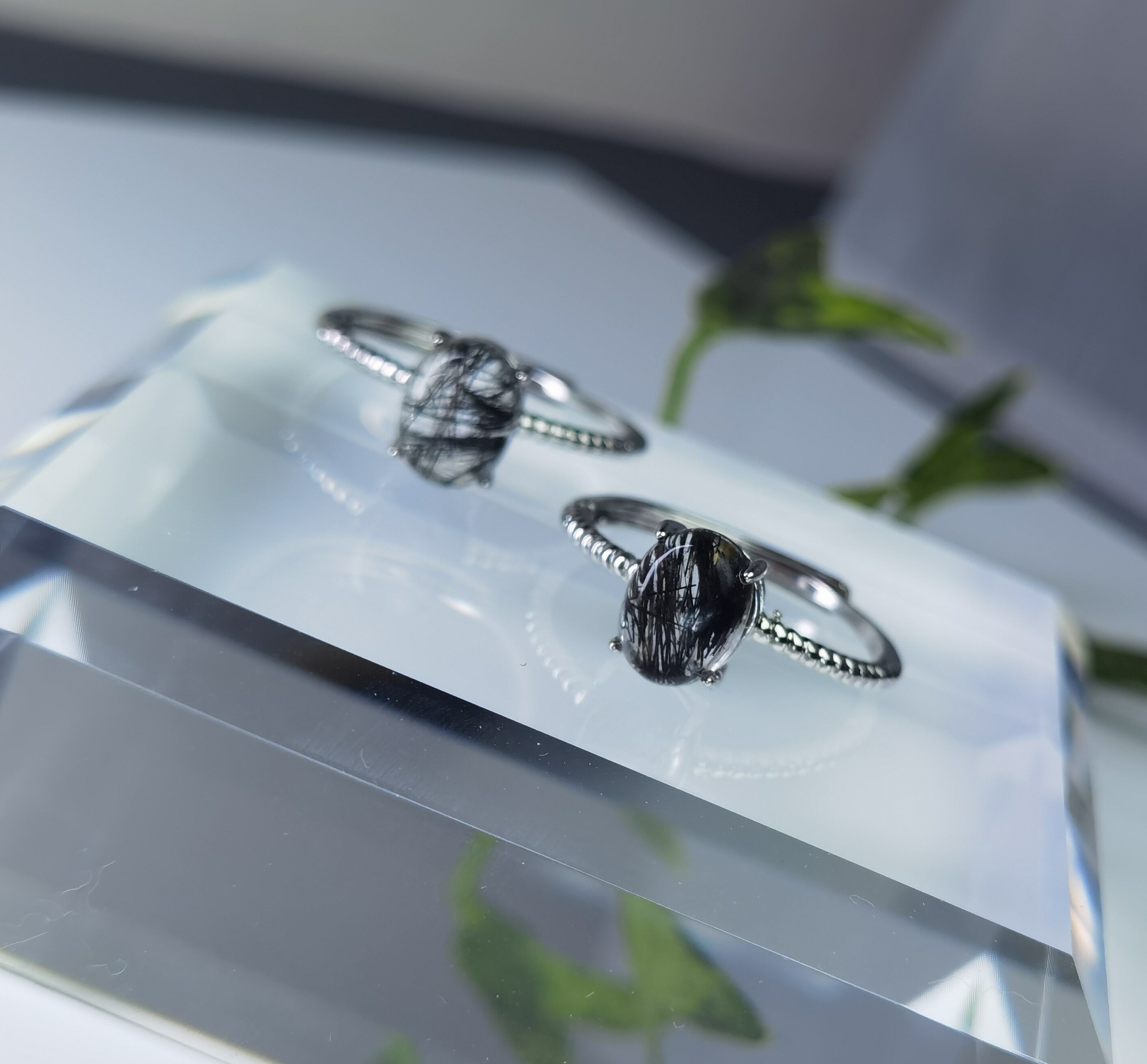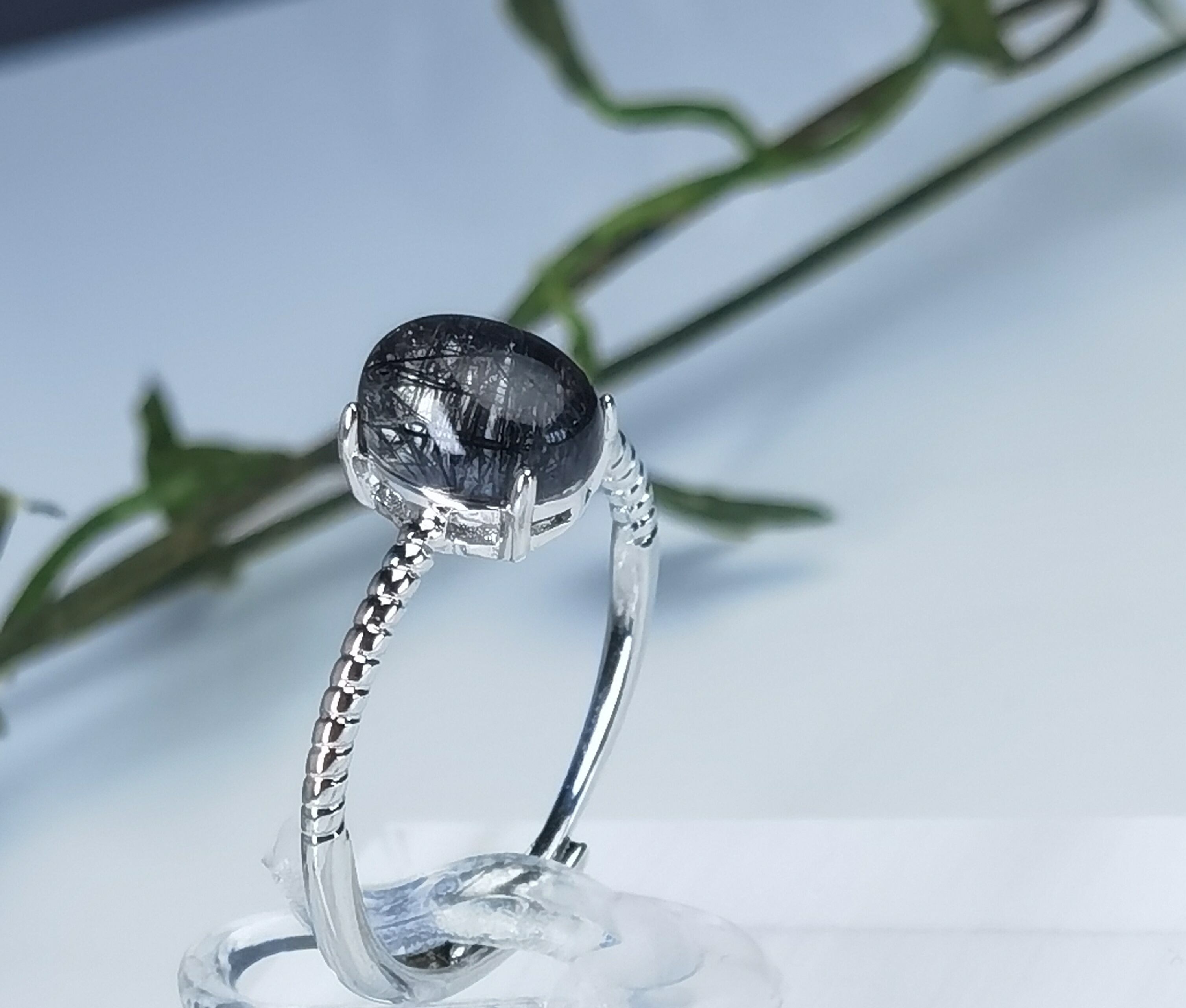 天然5Aグレードのブラックルチルクオーツを使用した、洗練されたシルバーリング。