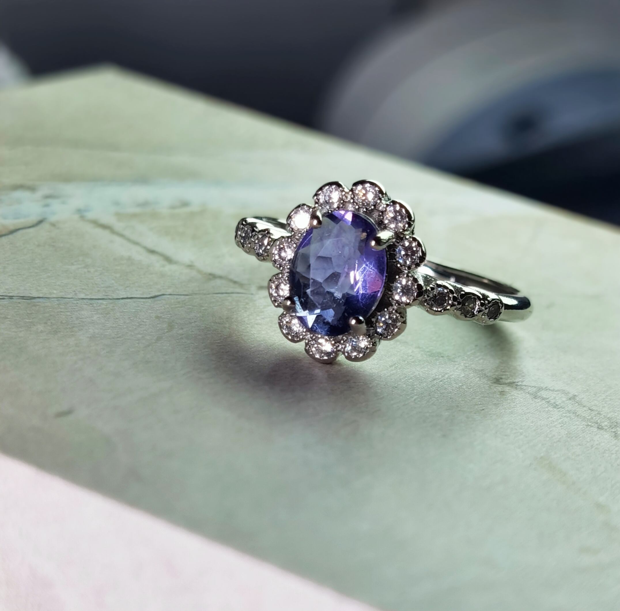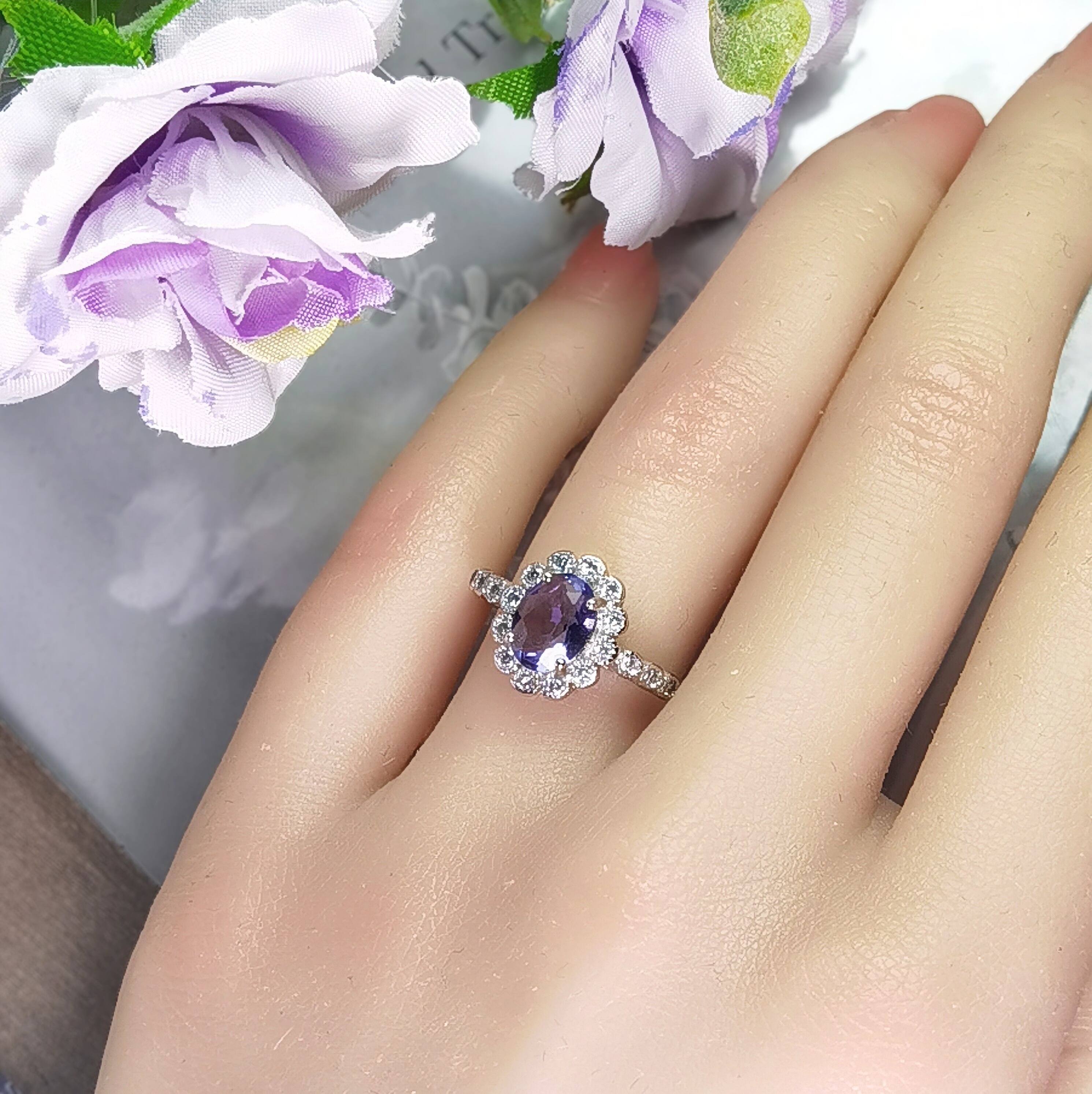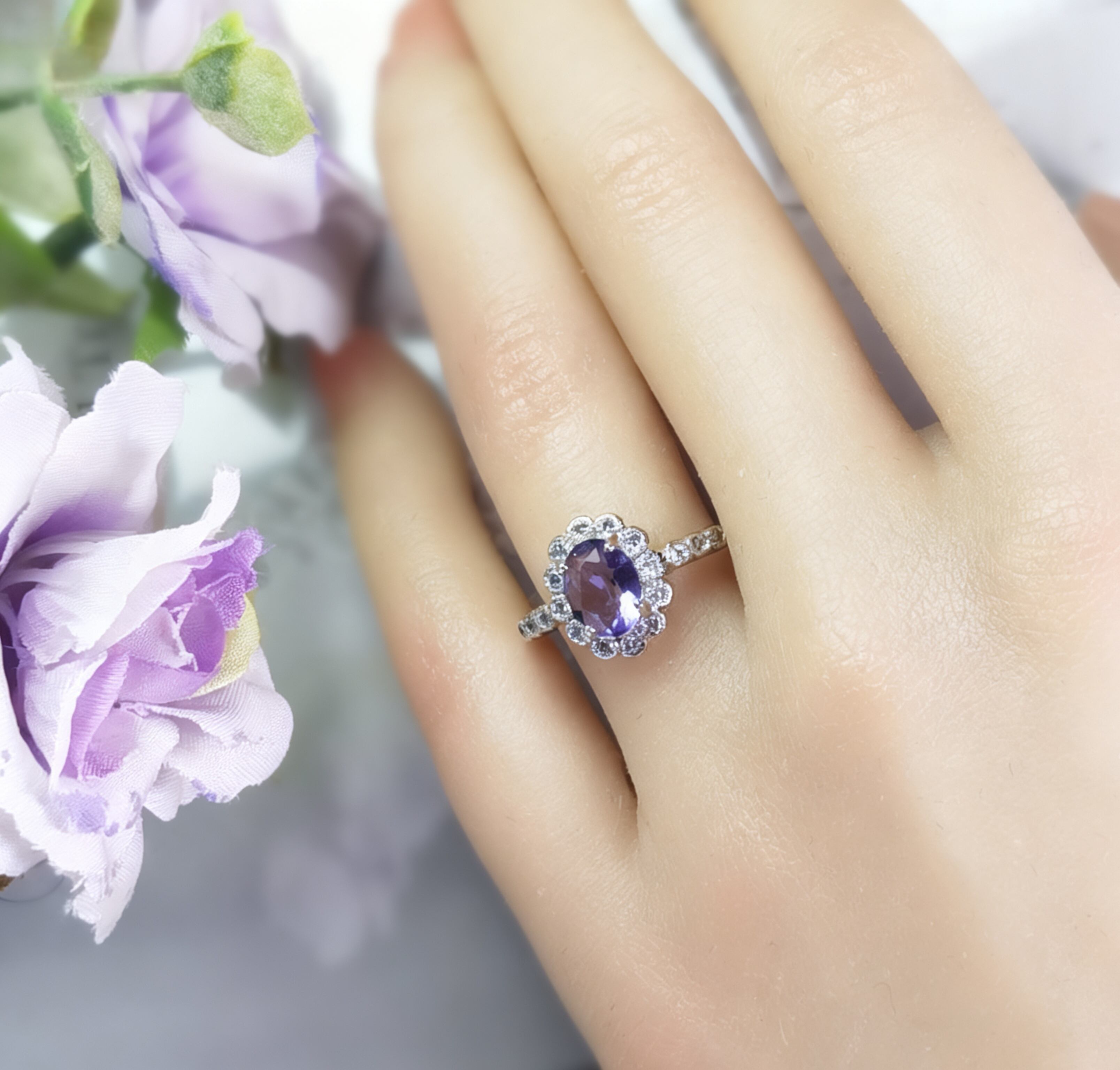 オーバルカットのアメジストは、光を受けるたびに奥行きのある紫色が美しく輝き、手元に上品な存在感を添えます。