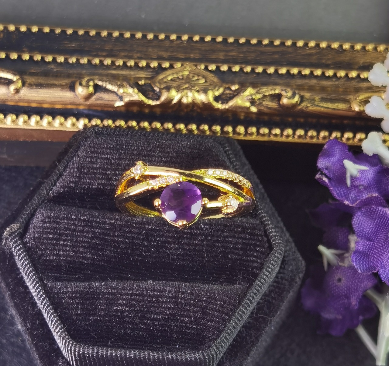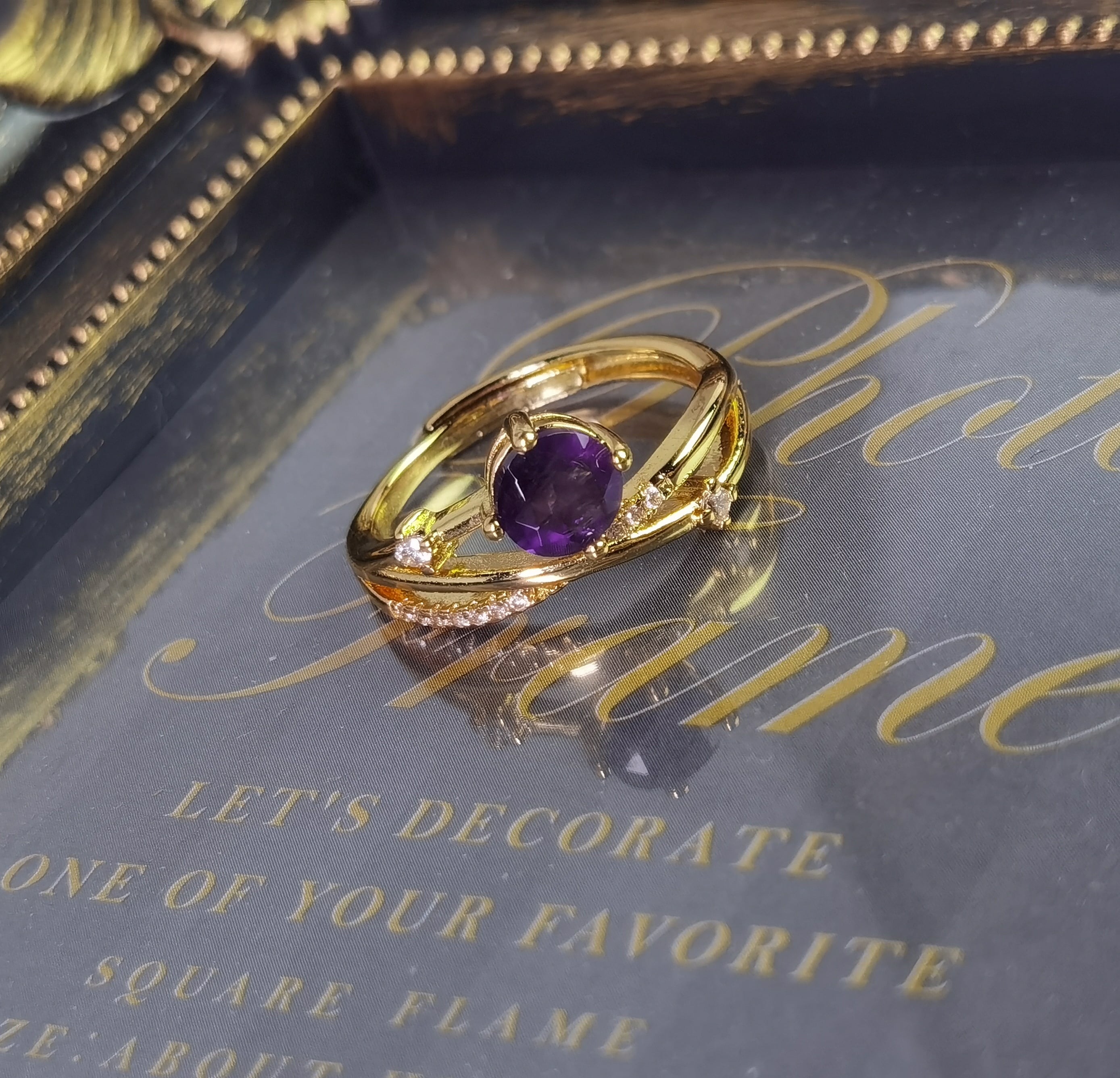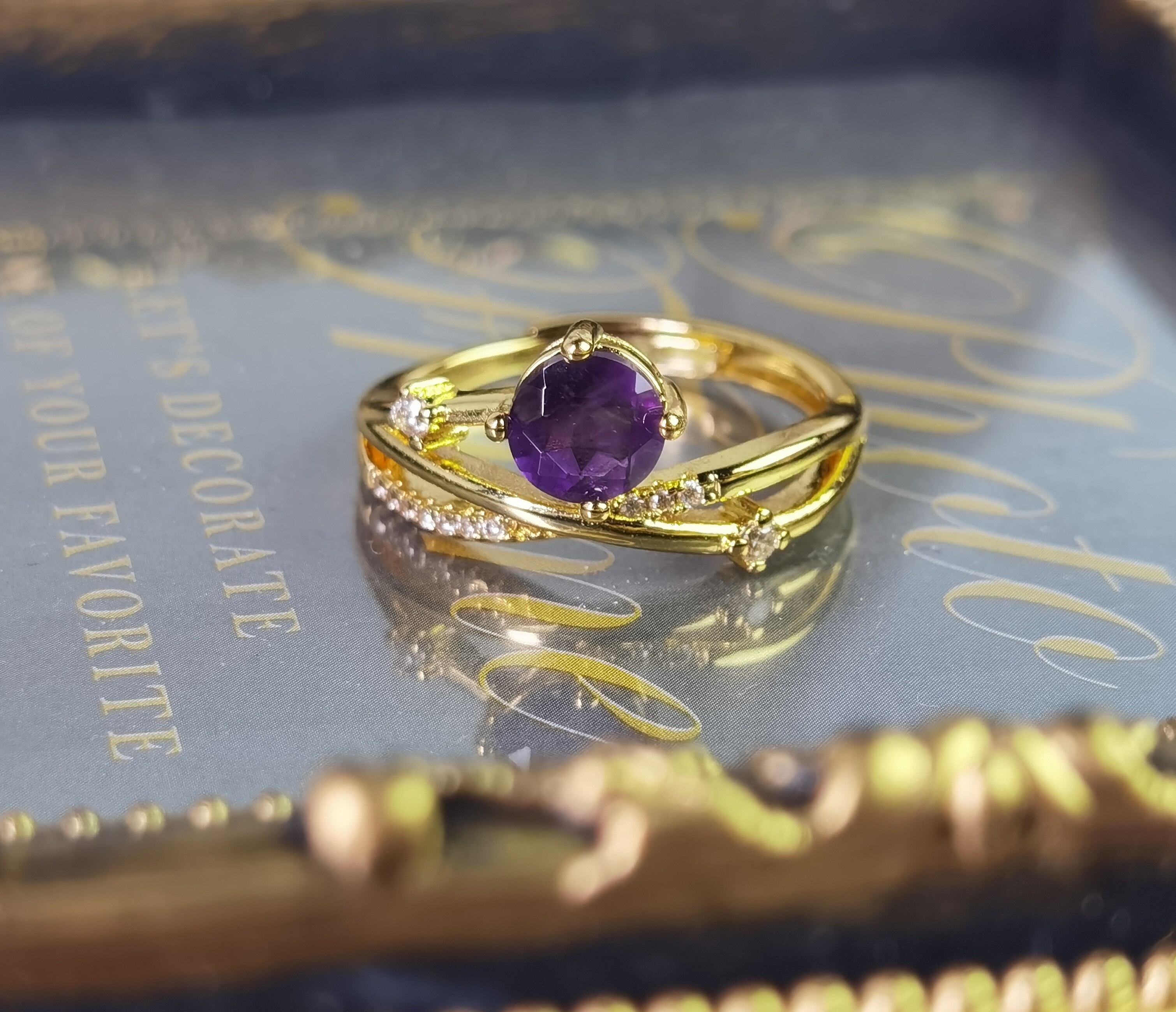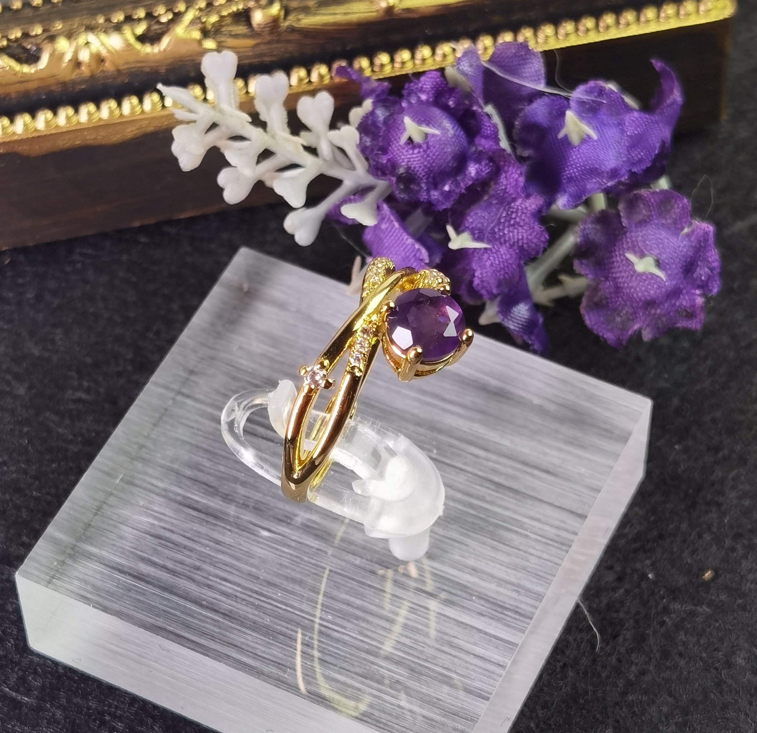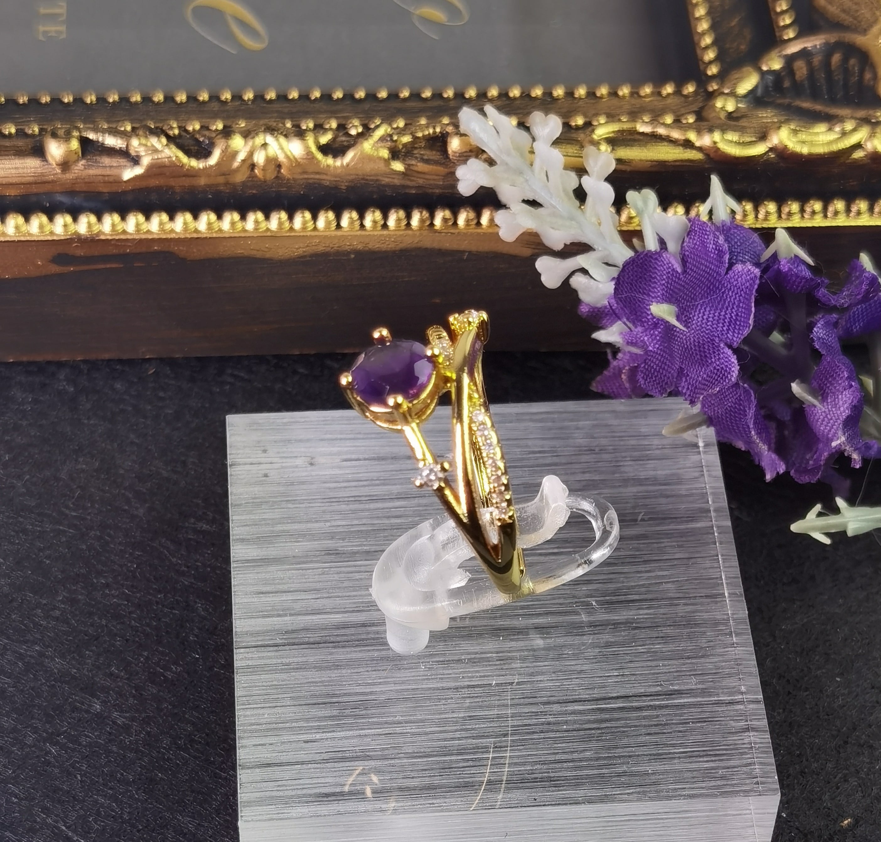 --☆このリングは、夜空を駆け抜ける紫の流星を思わせるアメジストの美しさが際立っています。中央に鎮座する鮮やかな紫色のアメジストは、まるで宇宙の不思議を映し出す宝石のよう。その周囲を飾るジルコニアは、小さな星々がキラキラと輝く姿を連想させ、エレガントでありながらもプレイフルなデザインが特徴です。GOLDの輝きとアメジストの深い紫が織り成すコントラストは、どんな装いにも洗練されたアクセントを加えてくれるでしょう。流星と星々が夜空に描く物語のように、身に着ける人の日常にもロマンチックな輝きを添えてくれます。