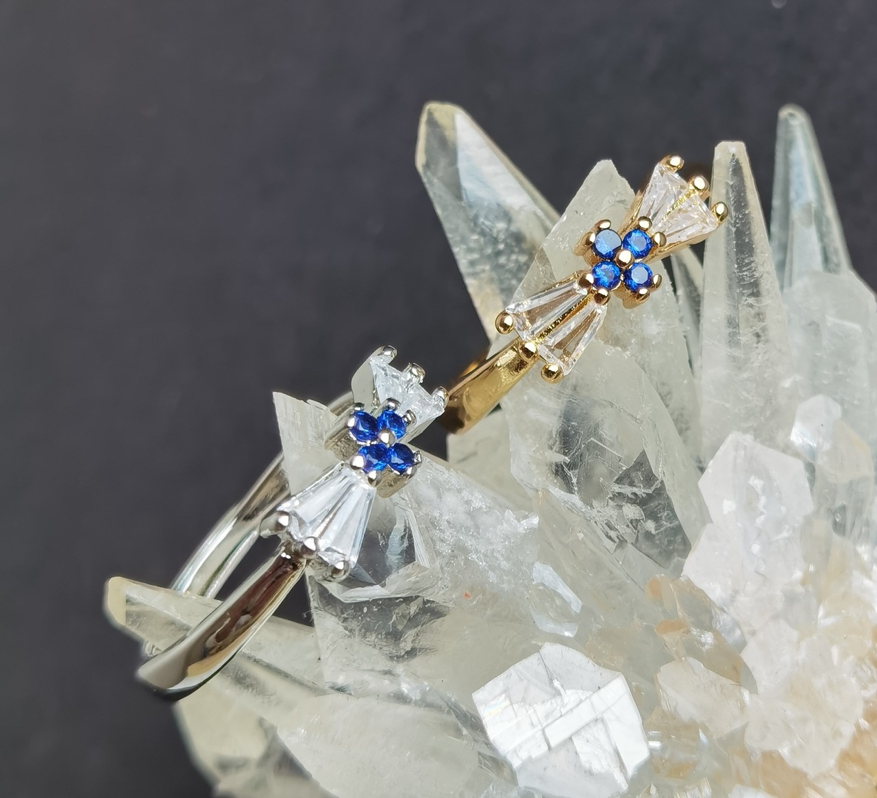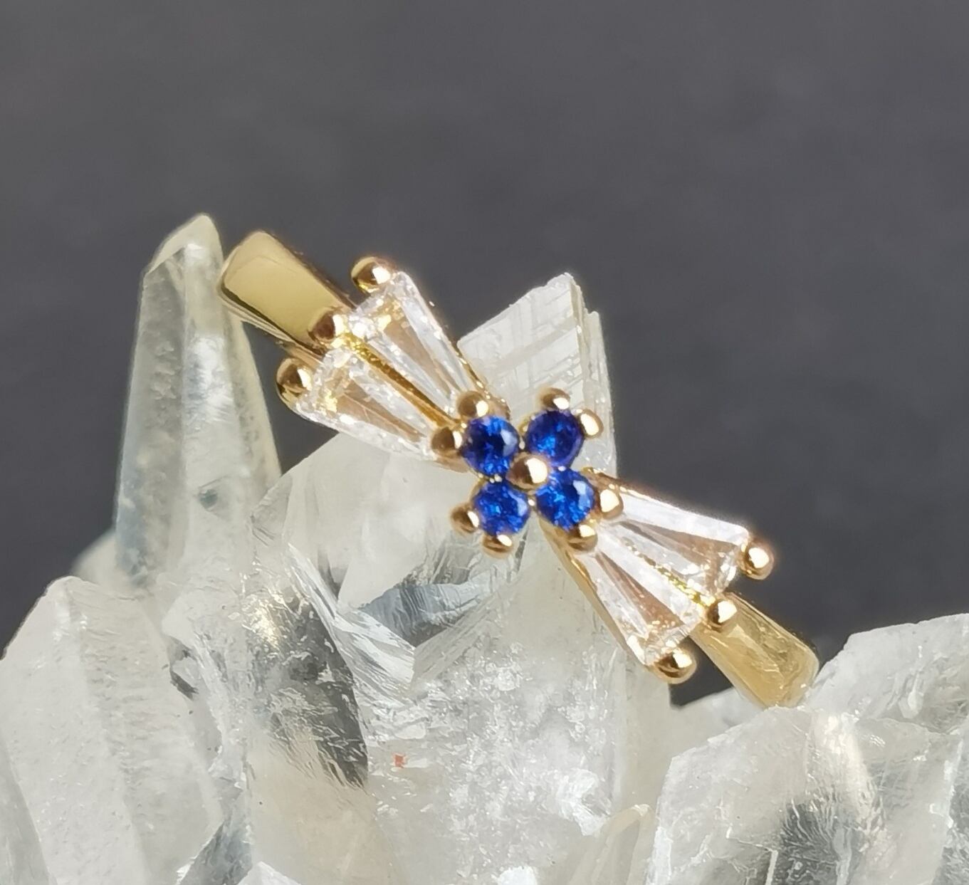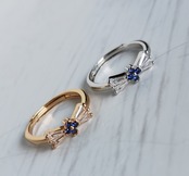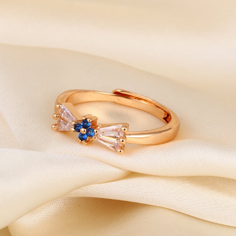 --☆この「CZサファイア」をあしらったダイヤリボンのビジューリングは、その繊細かつエレガントなデザインで、上品な魅力を放っています。キュービックジルコニアのダイヤモンドのような輝きと、深い青のサファイア色が絶妙なコントラストを生み出し、リボンの形をしたデザインが愛らしさをプラスしています。